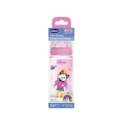 Biberon Plastique Chicco Rose 330ml. Anti-Cholique âge à partir de 4 mois et plus. Biberon plastique en PP (Polypropylène), matière 0% BPA. Incassable avec Décors ludiques et gais. Tétine physiologique en silicone avec valve anti-colique et Capuchon anti-fuites. Col large pour un nettoyage et un remplissage simplifiés. Compatible avec toutes les tétines physiologiques Chicco.