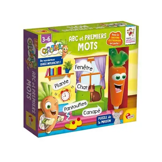 Carotina et les premiers mots de la marque Lisciani est un excellent abécédaire interactif pour apprendre l’alphabet et découvrir plein de petits mots. Plein de quiz pédagogiques pour pratiquer la logique et enrichir le vocabulaire en compagnie du bébé carotte parlant et lumineux ! Tranche d’âge: 3-6 ans, avec le stylo de Carotina parlant et lumineux, Un excellent abécédaire interactif pour apprendre l’alphabet et découvrir les premiers mots.