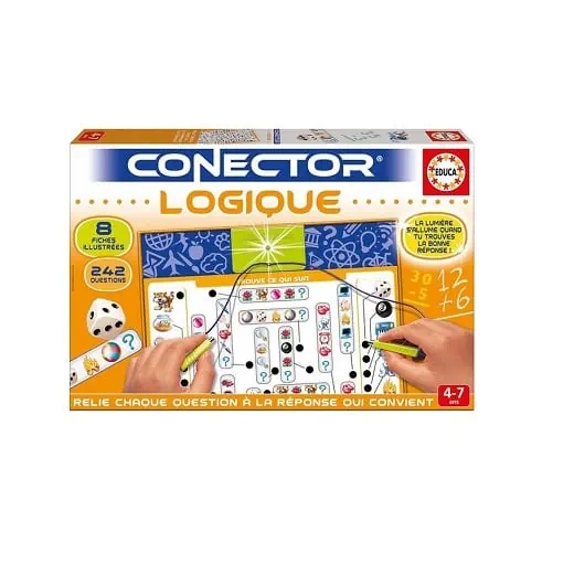 Connector Logique, marque Educa. L’indémodable jeu de questions-réponses. 8 thèmes pour s’amuser tout en travaillant les capacités de raisonnement. 8 fiches illustrées et 242 questions. Le jeu éducatif parfait. Age a partir de 5 ans et plus.