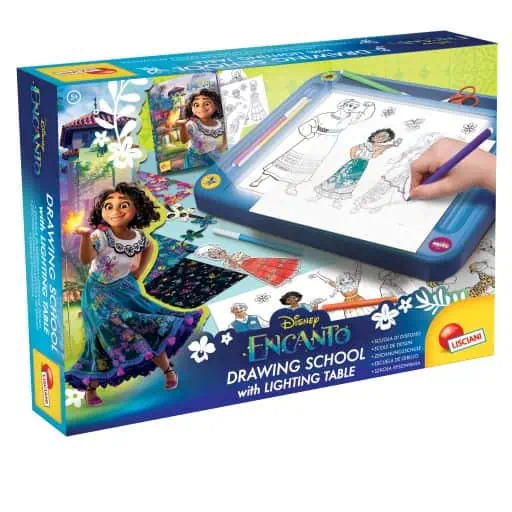 L’Ecole dessin Encanto de Lisciani contient une table lumineuse magnifique pour apprendre à dessiner. Age de 3 à 6ans et même plus. La marque Lisciani est la référence en matière de jeux et jouets éducatifs. Amuses toi avec la table lumineuse magique et apprends à dessiner les protagonistes de ton film Encanto préférés ! Il suffit d’allumer la table LED et de projeter sur une feuille blanche l’image que tu préfères! Dessines et recopies les bordures pour obtenir ton dessin préféré! Tu trouveras également dans la boîte des pochoirs, des autocollants et des couleurs pour décorer la petite table-même et toutes tes créations
