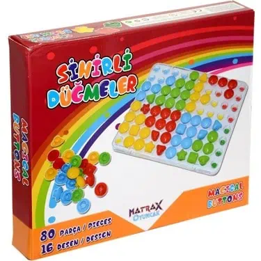 Le Jeu de création de la marque Matrax avec boutons magiques est un jouet destiné aux plus jeunes, il s’agit d’une plaque en plastique composée d’une multitude de petits trous… L’enfant dispose d’une boite composée d’un assortiment de boutons colorés en plastique, de différentes formes et tailles qu’il faut insérer dans la plaque afin de réaliser un dessin ! Laissez place à son imagination!