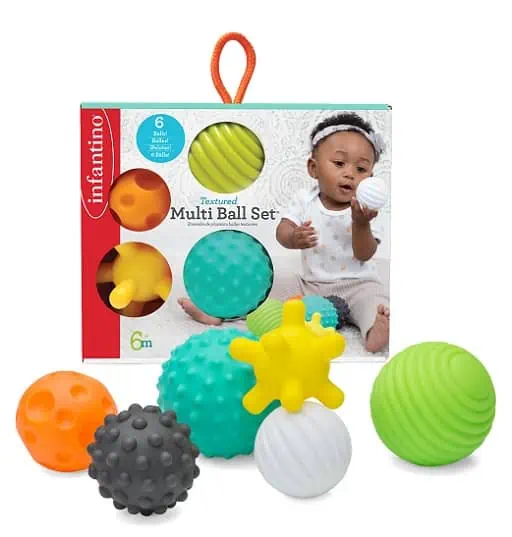 Jouet bébé balles sensorielles de la marque Infantino. Dimensions 24 cm x 6 cm x 21 cm. A partir de la naissance, ce jouet est un excellent jouet 1er âge. Age de 6 mois et plus. Un jouet parfait pour les bébés!