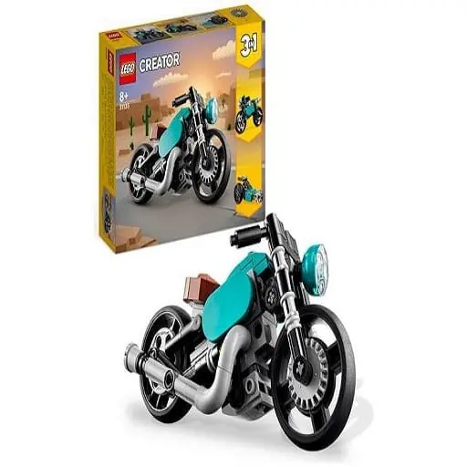 Coffret La Moto Ancienne de la marque Lego. age 8 ans et plus contient 128pcs. Ce jouet de construction LEGO Creator 3-en-1 pour enfants comprend 3 modèles à construire : une moto vintage, une moto de rue et un dragster. La moto vintage est équipée d’un guidon et d’une roue avant mobile, de phares, d’un gros pot d’échappement et d’un support pour créer une belle exposition dans la chambre des enfants. Quand vient le temps de faire des courses à grande vitesse, la moto d’époque peut être transformée en une moto de route avec une béquille ou en un puissant dragster. Les enfants peuvent mettre en scène 3 histoires différentes : conduite à la campagne sur une moto, découverte de la ville sur une moto de rue ou course sur circuit avec un dragster « top fuel. La moto jouet a une taille idéale pour les enfants de 8 ans et plus qui peuvent jouer à la maison ou l’emporter partout où ils vont pour faire vivre des histoires à grande vitesse à leurs amis