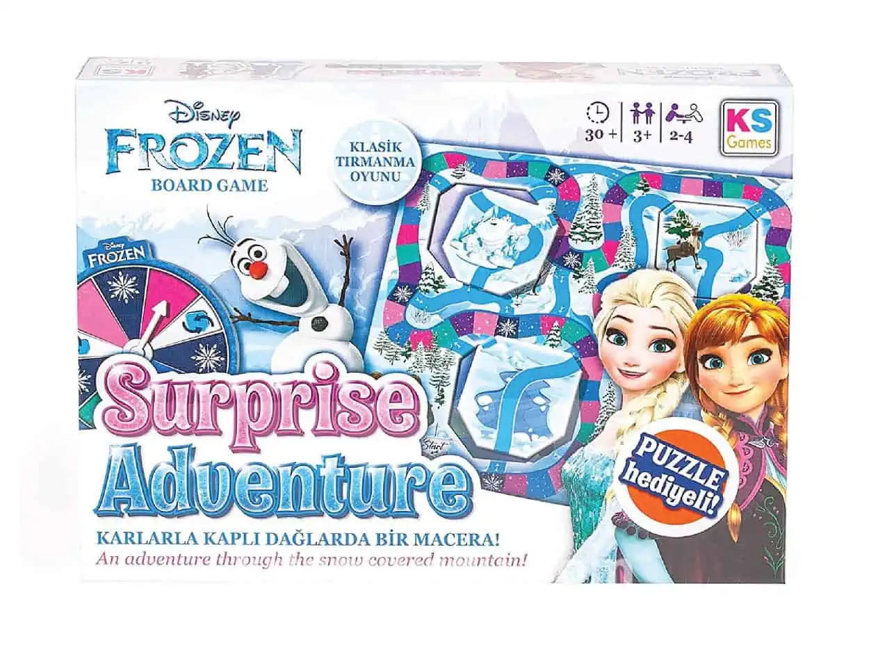 Jeu de société les aventures de la princesse Frozen de KSGAMES. On le joue à partir de 5 ans. KS Frozen Surprise Adventure est un Jeu de société dont Le but du jeu est d’être le premier à atteindre l’arrivée pour remporte la partie. Jouons! Ouvrez le plateau de jeu et placez les cartes dans les fentes du plateau. Chaque joueur choisit un personnage, les attache à leurs supports et les place au point de départ. Le plus jeune joueur commence le jeu en faisant tourner la roulette. S’il atterrit sur une couleur, le joueur déplace son personnage vers cette case de couleur.