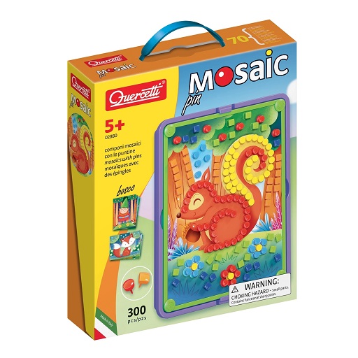 Mosaique pin 300 de la marque Italienne Quercetti,  Jeu éducatif  et d’éveil par excellence. À l’aide des 300 épingles colorées, rondes ou carrées, vous pouvez percer les 8 fiches illustrées, en suivant la couleur visible en dessous pour créer de magnifiques mosaïques. Le cadre mettra votre œuvre d’art en valeur et le panier vous permettra de ranger toutes les épingles en fin de journée. La création de mosaïques, en insérant les épingles dans les fiches, est une activité amusante et créative, qui stimule la sensibilité artistique et entraîne la coordination yeux-mains.