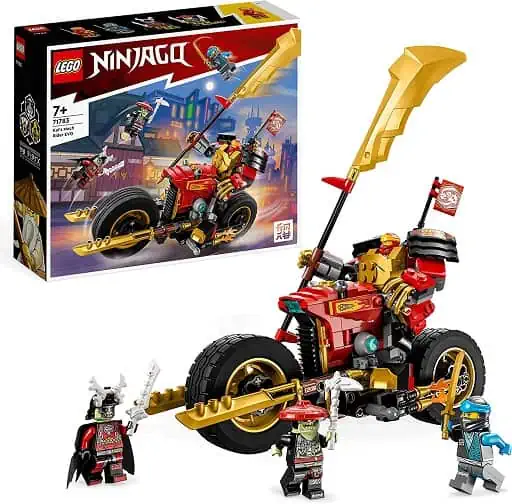 Coffret La Moto de Kai Ninjago de la marque Lego. Age 7 ans et plus contient 312pcs. LEGO NINJAGO Kai’s robot Rider comprend une moto ninja améliorable, une figurine articulée et 4 minifigurines pour des batailles ninja épiques. Les jeunes fans de NINJAGO construisent une grande moto ninja avec d’énormes roues, puis l’améliorent en ajoutant des pots d’échappement enflammés et des panneaux latéraux dorés. La figurine articulée NINJAGO robot peut monter sur la moto ninja ; le robot peut accueillir une minifigurine et une grande lame dorée. Comprend les minifigurines LEGO NINJAGO Kai et Nya avec des épées, et 2 méchants – Roi squelette avec une épée et Chasseur squelette avec une pioche en os et une épée. Lorsque les enfants auront relevé leur défi et vaincu les guerriers de l’os vert, les garçons et filles seront récompensés par une bannière Focus à collectionner à afficher depuis le jouet moto de ninja.