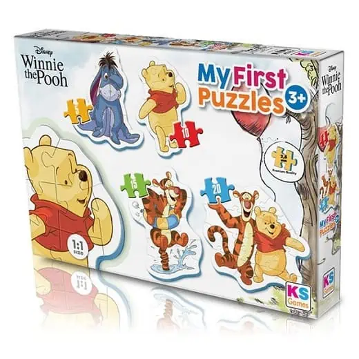 Puzzle Winnie 4en1, 5, 10, 15 et 20pcs, marque KSGAMES. Puzzle de très haute qualité, carton épaisseur de 2.5mm et impression haute définition pour avec un assemblage parfait. A partir de 3 et plus.